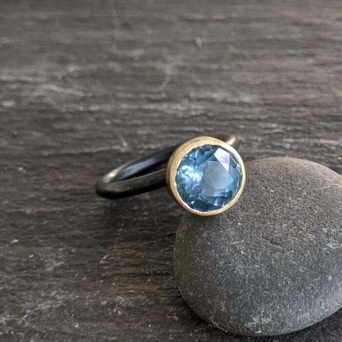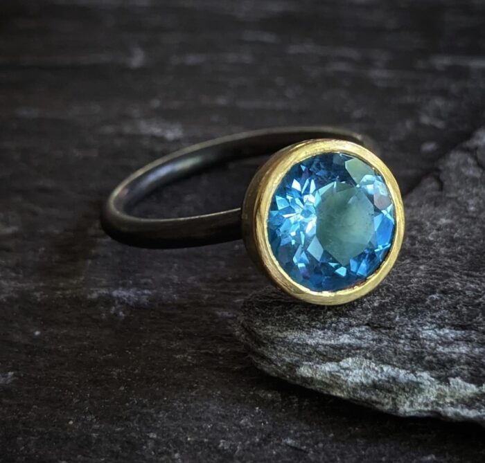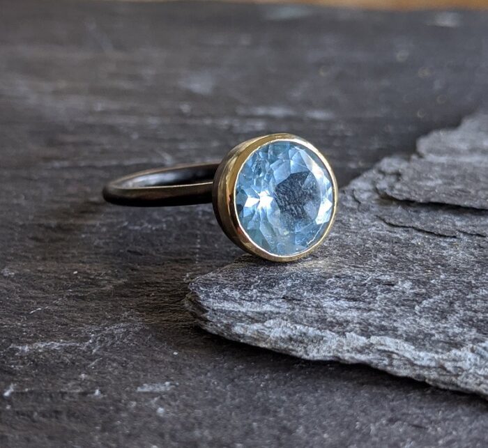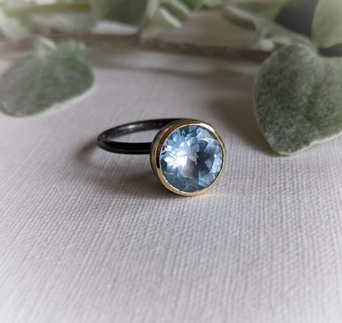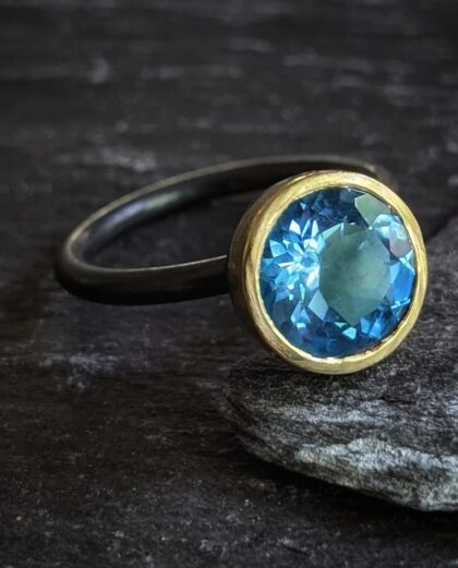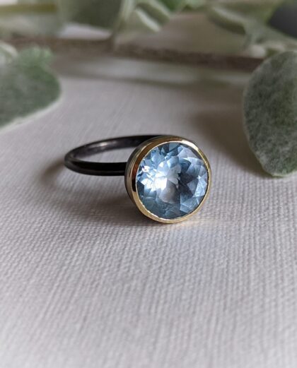 sterling silver and 18ct yellow gold with 9mm pale or mid blue topaz.