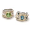 Sterling silver and 18ct gold, London blue topaz approx. 10mm x 8mm, 5mm, 4.5mm and 3mm. 2.8mm and 2mm diamonds, 9mm – 18mm band