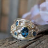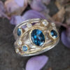 This beautiful one of a kind ring is crafted from textured silver and 18ct gold wire which is wrapped and woven before being set with set with London blue topaz and a sparkly diamonds.