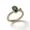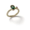 This beautiful ring, created from textured and hand formed 18ct yellow gold, has a lovely collet set oval green tourmaline, and a small round brilliant cut diamond set on to the side.