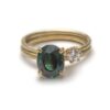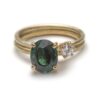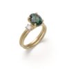 18ct yellow gold, 9×7.4mm teal tourmaline and 0.22ct diamond. 2mm and 1.5mm bands, 4mm high settings.