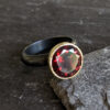 This beautiful ring, created from oxidised hand formed silver, has a stunning dark red almadine garnet set in an 18ct gold gum nut setting .