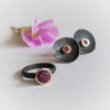 This beautiful ring, created from oxidised hand formed silver, has a stunning pink red rhodalite garnet set in an 18ct gold gum nut setting .