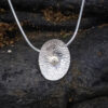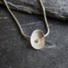 This pendant, created from textured and hand formed silver, consists of a single petal hanging on a fine silver chain, set with a lovely round brilliant cut diamond in 18ct gold.