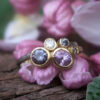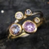 This beautiful set, created from textured and hand formed 18ct white and yellow gold, consists of a stunning pink sapphire, a lovely round purple spinel, with clustered champagne diamonds and spinel set in a warm yellow gold , with 5 round brilliant cut diamonds scattered around the band to add sparkle.