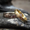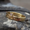This beautifully elegant ring is hand formed from textured 18ct gold, set with 12 scattered diamonds and a central diamond. These bands have been designed to be comfortable and wearable. I can texture these bands heavily or lightly, please just let me know your preference