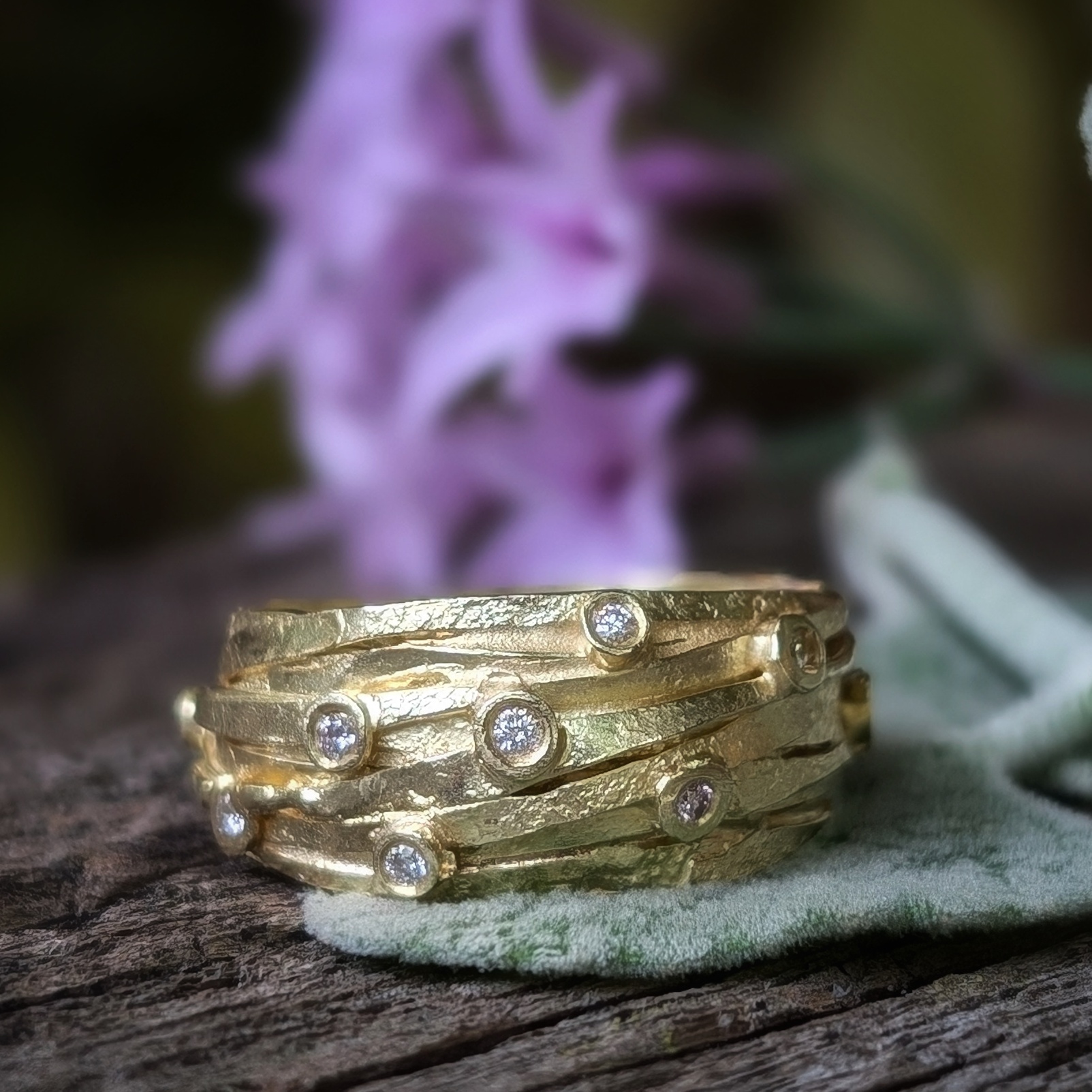 Hammered and textured 18ct gold wire, is wrapped and woven and set with tiny diamonds, producing a unique ring that is beautifully simple and elegant.